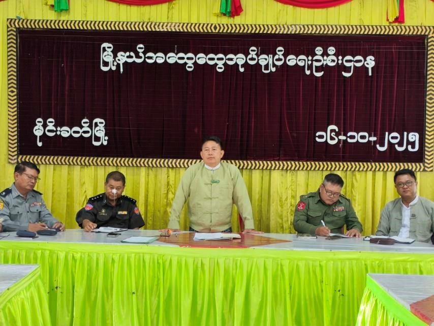၂၀၂၅ ခုနှစ်၊ အောက်တိုဘာလ ၁၆ ရက် နံနက် ၁၀ နာရီတွင် ကျိုင်းတုံခရိုင်၊ မိုင်းခတ်မြို့နယ် အထွေထွေအုပ်ချုပ်ရေးဦးစီးဌာနရုံး အေးချမ်းသာခန်းမ၌ ကျင်းပပြုလုပ်သည့် ၂၀၂၅ ခုနှစ်၊ ပါတီစုံ ဒီမိုကရေစီ အထွေထွေရွေးကောက်ပွဲတွင် မဲဆန္ဒရှင်စာရင်းမှန်ကန်စေရေးနှင့် အသက်(၁၈)နှစ် အထက် ဆန္ဒမဲ ပေးပိုင်ခွင့်ရှိသူများ စာရင်းမကျန်ရှိစေရေးလုပ်ငန်းညှိနှိုင်းအစည်းအဝေးသို့ မြို့နယ် စီမံခန့်ခွဲရေးနှင့်အုပ်ချုပ်ရေး ကော်မတီဥက္ကဋ္ဌ မြို့နယ်အုပ်ချုပ်ရေးမှူး ဦးဟန်ဝင်းလတ် ဦးဆောင်၍ မြို့နယ်ရွေးကောက်ပွဲကော်မရှင်အဖွဲ့ခွဲမှတာဝန်ရှိသူများ၊ သက်ဆိုင်ရာဌာနတာဝန်ရှိသူများ၊ ရပ်ကွက်/ ကျေးရွာအုပ်စုအုပ်ချုပ်ရေးမှူးများ နှင့်အတူ တက်ရောက်ဆွေးနွေးခဲ့ကြောင်း သတင်းရရှိပါသည်။