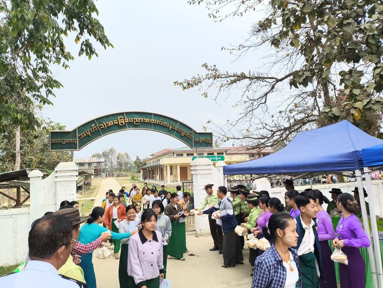 ၂၀၂၆ ခုနှစ်၊ မတ်လ ၁၇ ရက်၊ နံနက် ၉ နာရီတွင် ကချင်ပြည်နယ်၊ တနိုင်းခရိုင်၊ တနိုင်းမြို့၊ ပုန်ခုန်ကောင်းရပ်ကွက်၊ အထက(၁)ကျောင်း၌ ၂၀၂၅- ၂၀၂၆ ပညာသင်နှစ်တွင် Grade- 12 ကျောင်းသား/ ကျောင်းသူများ တက္ကသိုလ်ဝင်စာမေးပွဲဖြေဆိုနေမှုအခြေအနေများ၊ လုံခြုံရေးဆိုင်ရာကိစ္စရပ်များနှင့် ကျန်းမာရေးစောင့်ရှောက်ပေးနေမှုအခြေအနေများအား ခရိုင်စီမံခန့်ခွဲရေးနှင့်အုပ်ချုပ်ရေးကော်မတီ ဥက္ကဋ္ဌ ခရိုင်အုပ်ချုပ်ရေးမှူး ဦးမိုးဇော်လင်း၊ မြို့နယ်စီမံခန့်ခွဲရေးနှင့်အုပ်ချုပ်ရေးကော်မတီဥက္ကဋ္ဌနှင့် အဖွဲ့ဝင်များ၊ ပြည်သူ့လုံခြုံရေးနှင့်အကြမ်းဖက်နှိမ်နင်းရေးအဖွဲ့ဝင်များ စုစုပေါင်းအင်အား ၁၀၀ ဦးတို့ဖြင့် ကြီးကြပ်ဆောင်ရွက်ခဲ့ပြီး စာမေးပွဲဖြေဆိုကြသည့် ကျောင်းသား/ကျောင်းသူများအား ကိတ်မုန့်နှင့် အချိုရည်များ ပေးအပ်ခဲ့ကြောင်း သတင်းရရှိပါသည်။