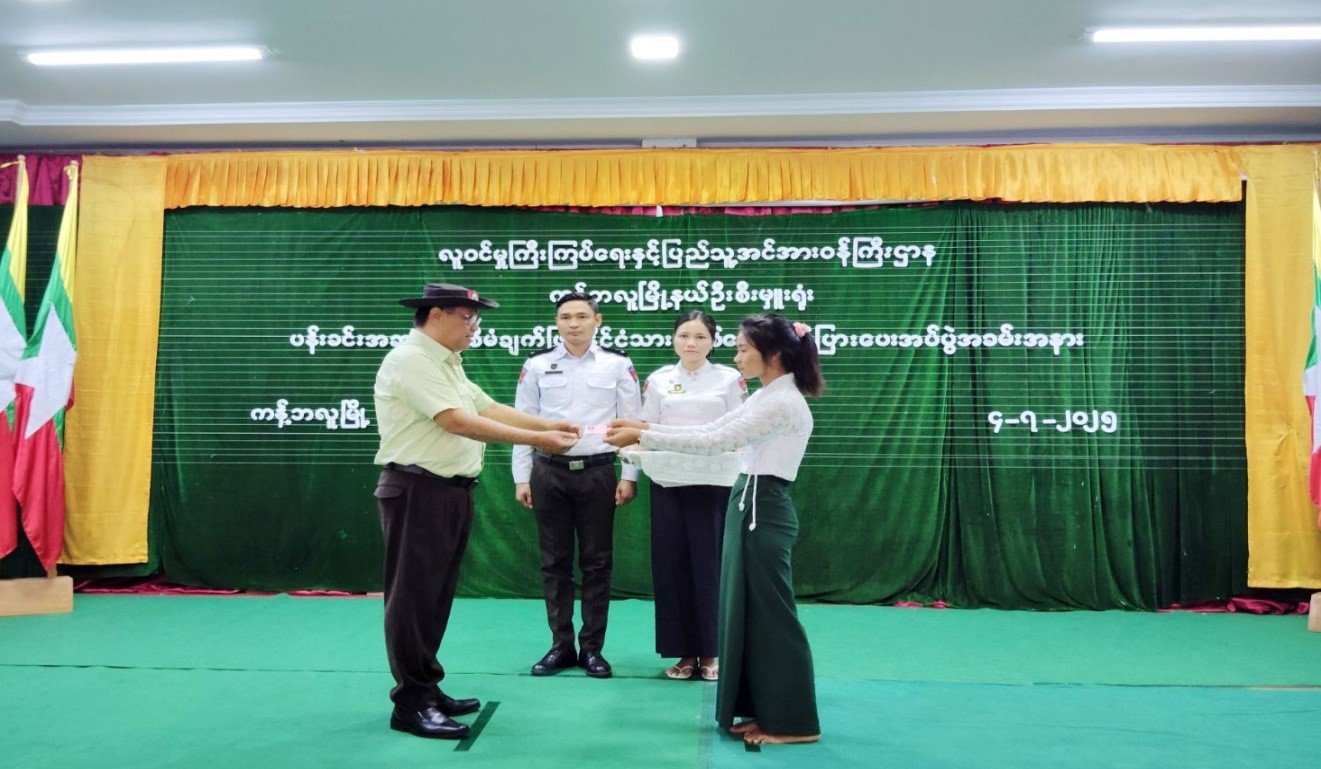 စစ်ကိုင်းတိုင်းဒေသကြီး၊ ကန့်ဘလူခရိုင်၊ ခရိုင်စုပေါင်းရုံးရွှေဆည်မြိုင် အစည်းအဝေးခန်းမ၌ ပန်းခင်းစီမံချက်အဆင့် (၃)ဖြင့် နိုင်ငံသားစိစစ်ရေးကတ်ပြား ပေးအပ်ပွဲအခမ်းအနားသို့ တက်ရောက်